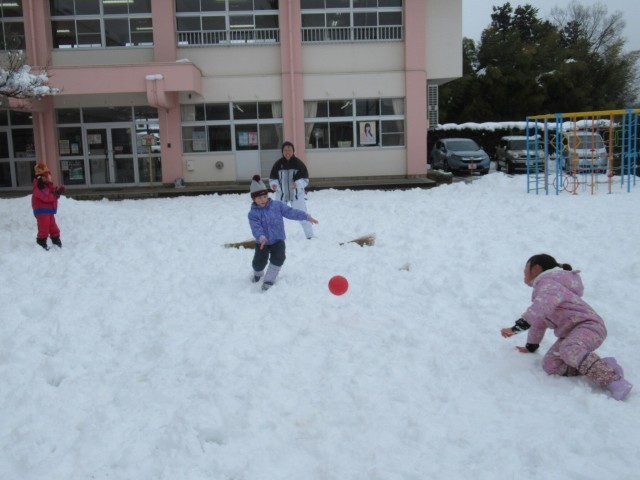 小学校から帰ってきてもまだまだ元気な子どもたち。園庭で雪上ドッジボールをすると、思うように動けなかったり、ボールが投げられなかったりして、笑いにあふれた時間になりました。