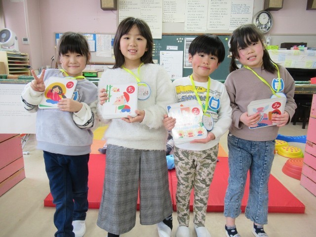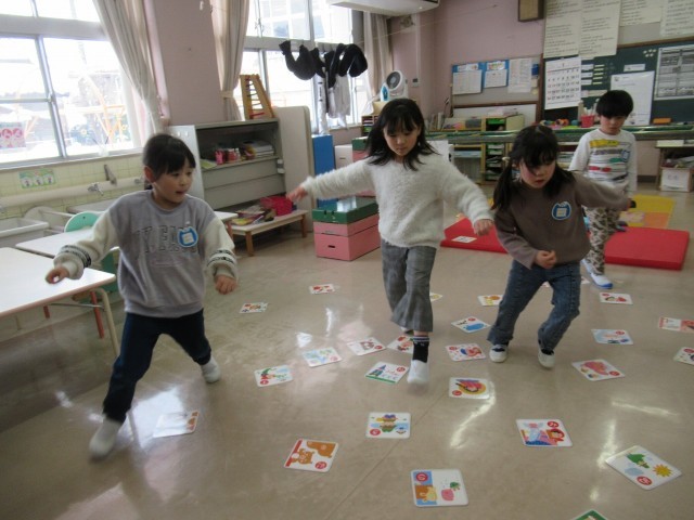 今までも何度かしてきたのですが、絵札が取れずに悔しい思いをしていた子、どこに何の絵札があるのかじっくりと見て覚えている子、自分の大好きな絵札をどうしても取りたくて意気込む子と様々な姿を見せていました。真剣勝負で機敏に動きながら、ねらった絵札を取り、元気よく「はい」と返事をしていました。
