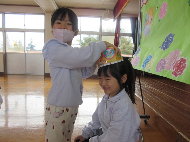 今日は2月生まれの誕生会がありました。みんなにお祝いしてもらい、少し照れながらも嬉しそう・・・。
