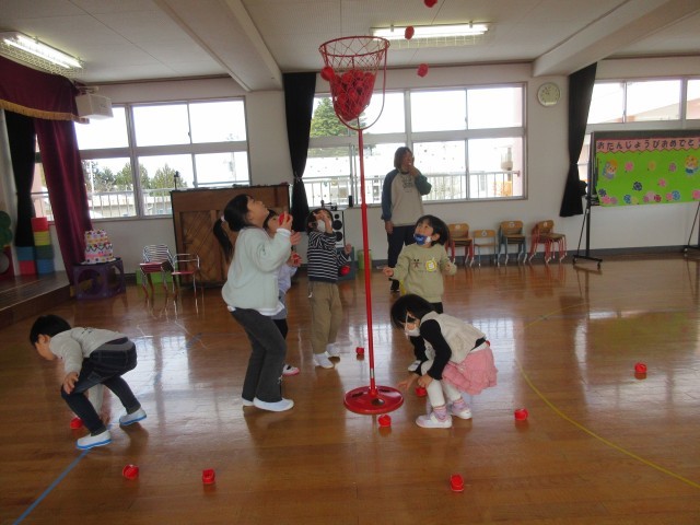 お楽しみコーナーでは赤と白に分かれて久しぶりに玉入れをしました。運動会のときよりかごを高くしましたが、両チームともたくさん玉を入れて大歓声が聞かれました。