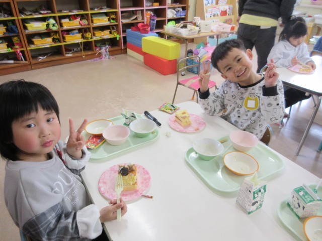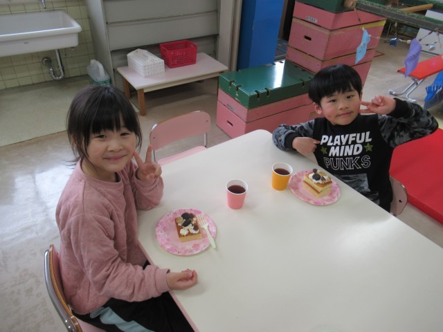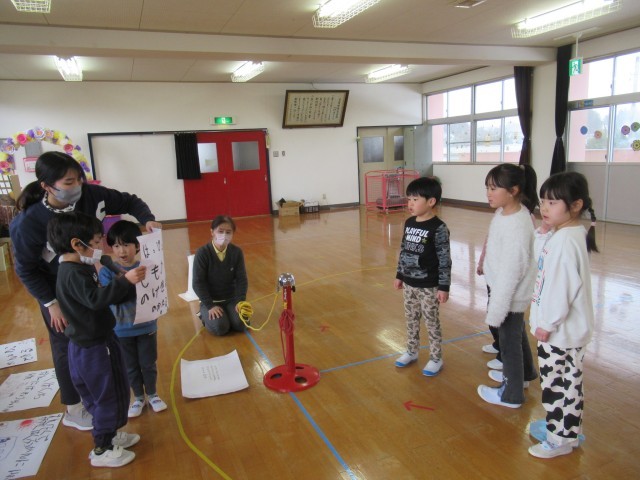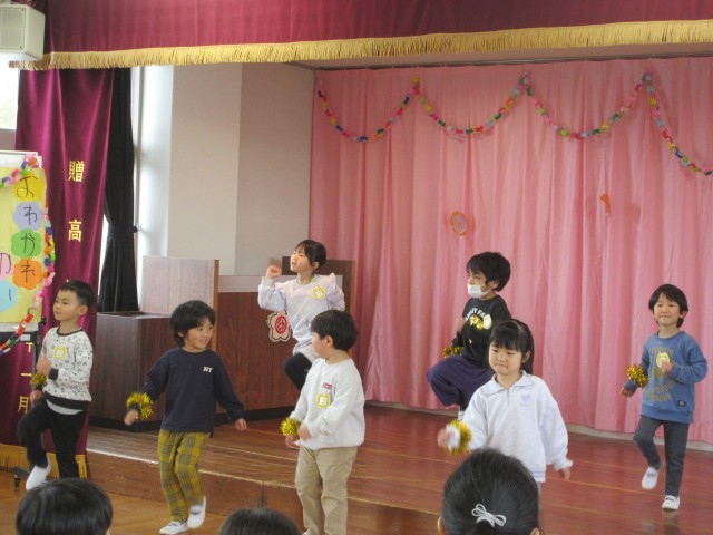次に、「思い出〇×クイズ」や「1年生になったらゲーム」、フォークダンス等をしてみんなで楽しくふれ合う時間となりました。プレゼントタイムではうさぎ組からはペン立てと首飾り、もも組からはマグネットをプレゼントしました。また、ばら組さんからはキーホルダーのプレゼントと配膳台のカバーをもらい、お互いに心を込めたプレゼントに笑みがこぼれました。