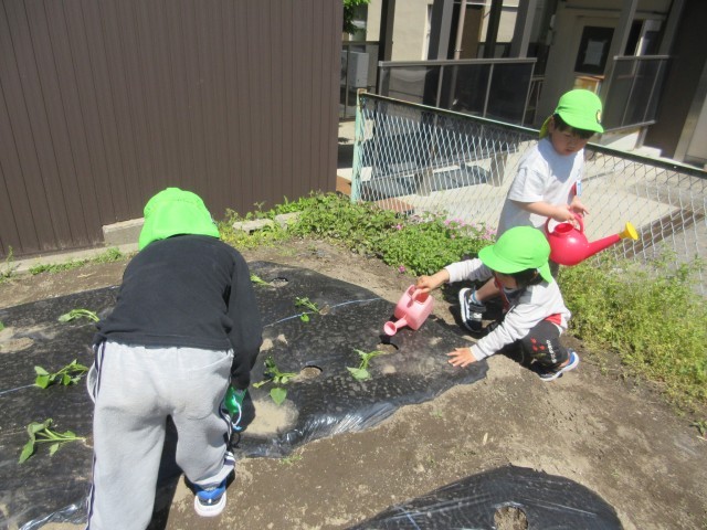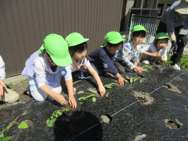 サツマイモの苗植え(全園児) 公開日 2025/05/09 更新日 2025/05/09 楽しい月岡幼稚園ニュース 5月8日(水) みんなでサツマイモの苗植えをしました。手で土を掘り、苗を置いて土をかけるという作業でしたが、苗を折らないようにと気をつけながら丁寧に植えていました。水もたっぷりとやり「甘いイモになってほしいね」「たくさん採れるといいね」と、収穫の日を楽しみにしてる様子でした。 楽しい月岡幼稚園ニュース