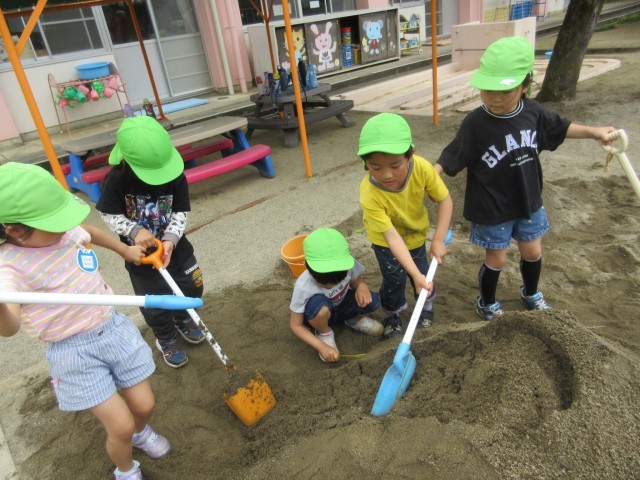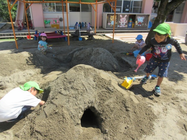 砂場では「大きな山をつくってトンネルをつくりたい!」と砂山づくりが始まりました。山ができると、左右からそれぞれ穴を掘り進めていきますが・・・途中で砂山が崩れてしまいました。「どうして崩れたんだろう」「もう一回やってみよう」「明日こそ成功させよう」と何日も挑戦しますが、崩れてしまいます。先生が「なんだか山が柔らかいみたい。どうやったら固い山ができるのかな」と言うと「水をかけて茶色の砂にしたらサラサラじゃなくなる」「叩いて固める」と気づいたことを話していました。作戦を練り直して、再挑戦!そして今日、ついにトンネルがつながりました。「頑張ってよかったね!」「トンネル4つもつながったね」と笑顔を見せていました。「明日は水を流したい」と、更に砂山がパワーアップしそうです。