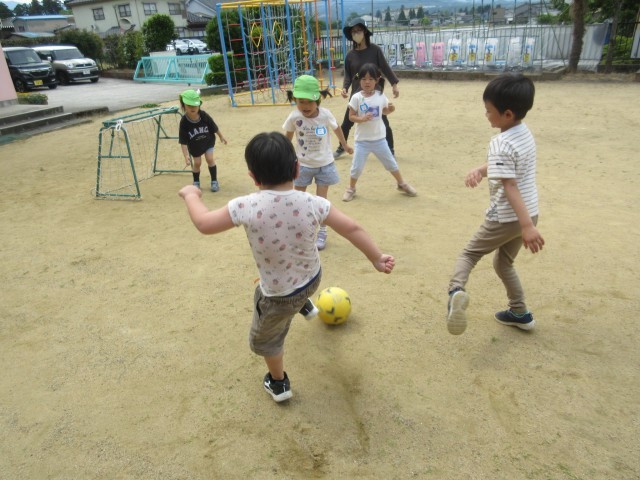 天気のよい日は野菜の水やりをした後、そのまま園庭で虫探しをしたり友達を誘ってサッカーをしたりなど、それぞれがしたい遊びを見つけて伸び伸びと遊んでいます。