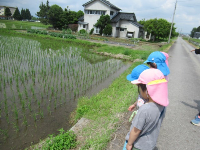 子どもたちは今、部屋でカエルごっこをして遊んでいます。「カエルの子はオタマジャクシだね」という話から幼稚園の近くの田んぼへ実際に見に行くことにしました。