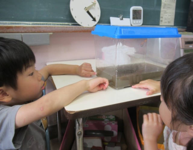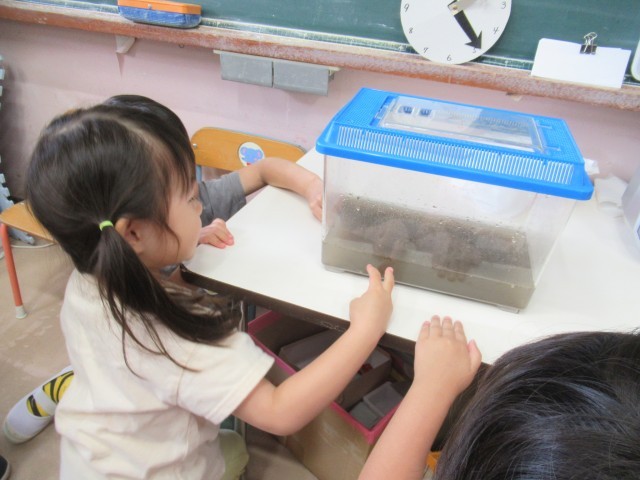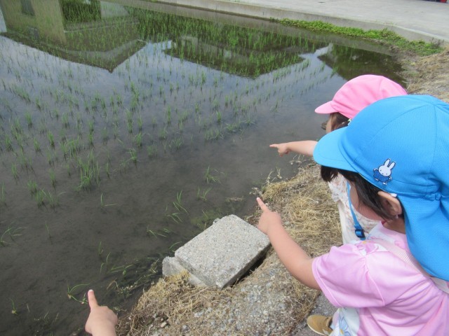 「オタマジャクシいるかな」と田んぼを覗き込むのですが、どこにオタマジャクシがいるのかなかなか見つけられません。先生がそっと水面を動かすと、動き出すオタマジャクシを見つけ「あっ、いた!」と嬉しそうでした。音や影に反応することがわかり、田んぼの淵で足踏みをすると一斉に動き出すオタマジャクシに大歓声!幼稚園に帰ってきてからは図鑑で「何食べるのかな」と調べ、観察する姿が見られました。