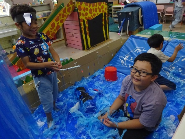 今日は普段の生活や遊びの様子を保護者の方に見ていただきました。もも・うさぎ組ではカエルやカタツムリになって池に入ったりリズムを踊ったりしました。大好きなお家の方に、自分たちの遊び場を見てもらい、とても嬉しそうでした。ばら組ではゾウに登ろうと何度も挑戦したり兄弟のお兄さんお姉さんと一緒にペンギンの水風呂に入ったりと、自分のしたい遊びに取り組む姿が見られました。