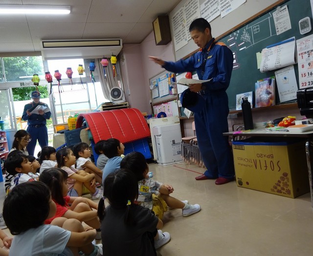 今回は幼稚園の配膳室から出火という想定で、ばら組保育室へ避難しました。静かに落ち着いて避難していました。消防署の方からは「おはしもの約束を守って避難してください」とお話をいただき、改めて約束を確認しました。