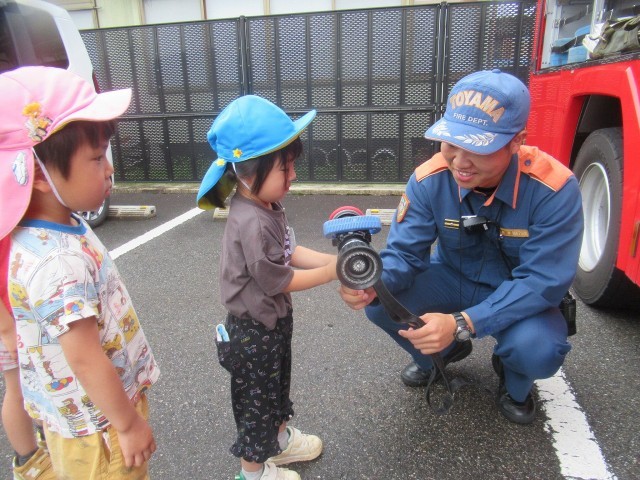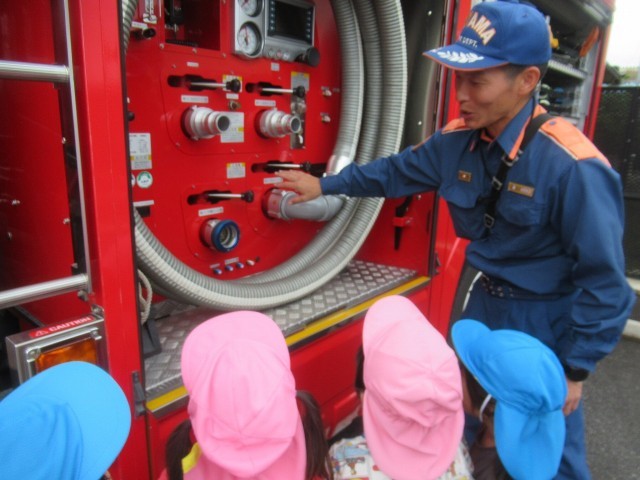 訓練の後には消防車両も見せていただき、興味津々に見入っていました。