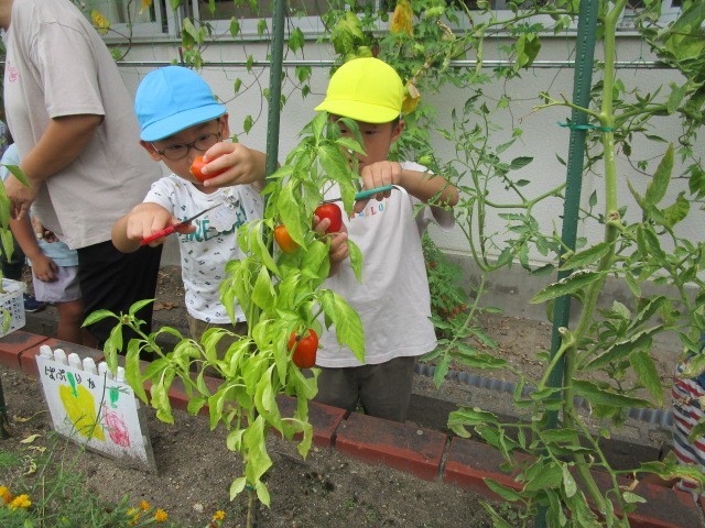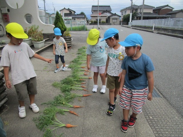 夏野菜の最後の収穫をしました。スイカやカボチャ、パプリカ、ナス、ニンジン。今日だけでもニンジンは36本収穫できました!「みんなでお世話した野菜だから」と、お土産にする野菜をみんなで相談して決めた子ども達です。