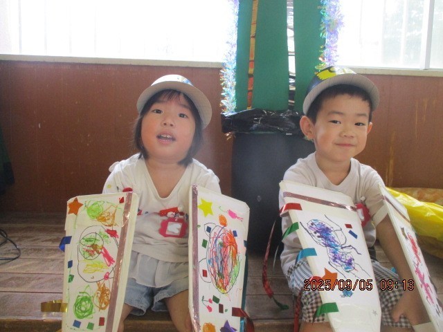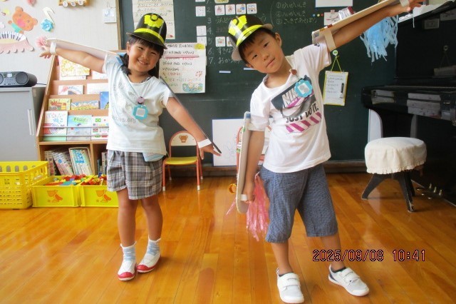 「いろんな国へ行ってみたいな」という声から、飛行機ごっこが始まりました。自分だけの翼をつくり、帽子を被り、気分はパイロット。今日はどこへいこうかな?
