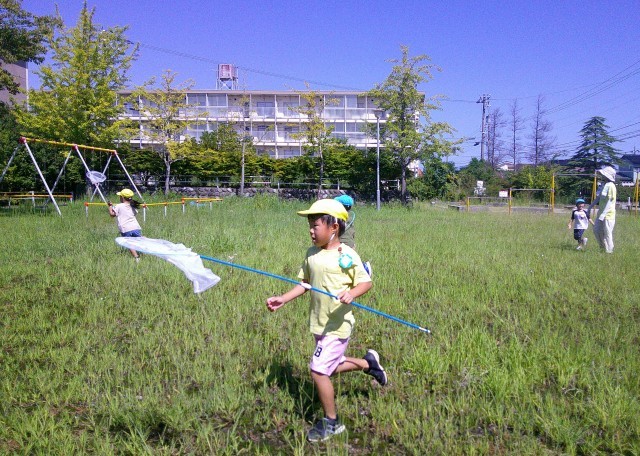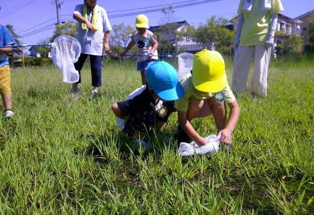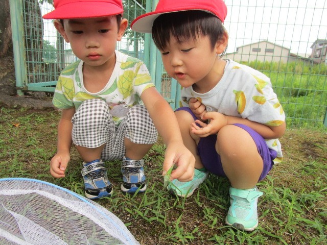 幼稚園の園庭では、バッタやトンボ、コオロギなど、いろいろな生き物に出会うことができます。虫が跳んで、止まったところを素早く網でキャッチ!友達と見付けては追い、かけまわる子ども達です。天気のいい日は、近くの公園までお散歩。どんな虫がいるか楽しみにしながら、早速虫探しを始めました。草むらで「今、ものすごく大きいトノサマバッタいたね」「空のあんな高いところまで跳ぶんだね!びっくりした」「いやー、あれはさすがに届かないでしょ~」と、毎回捕まえられる訳ではありませんが、生き物に出会うワクワク感を味わっているようでした。