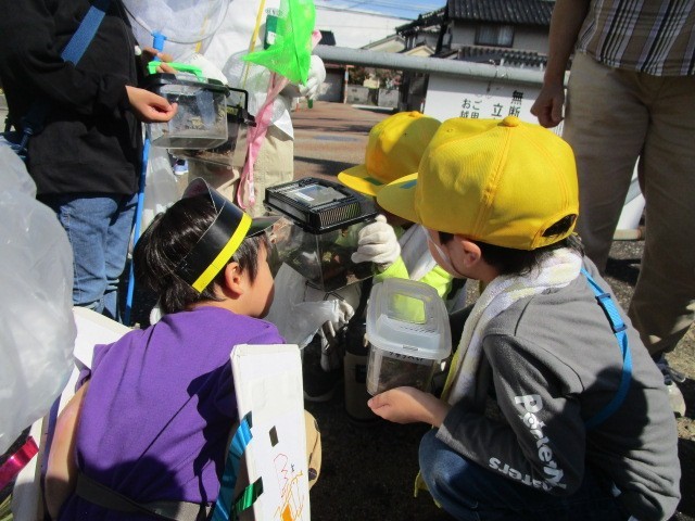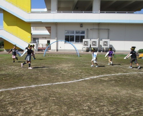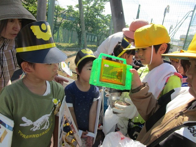 飛行機になって園庭を飛び回って遊んでいると、小学校のグラウンド近くで1年生の姿が見えました。公園で虫捕りをした帰りとのこと。見せてもらうと「大きいバッタがいっぱいだ!」「どうやってこんなに捕まえたの?「まん丸いコオロギもいるね」と目を輝かせる子ども達でした。