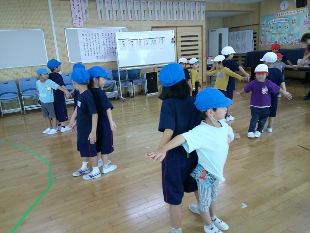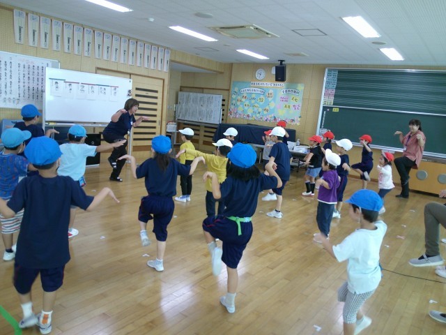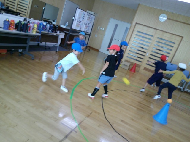 3回目の交流会は小学校ランチルームで、体育の授業を一緒に行いました。