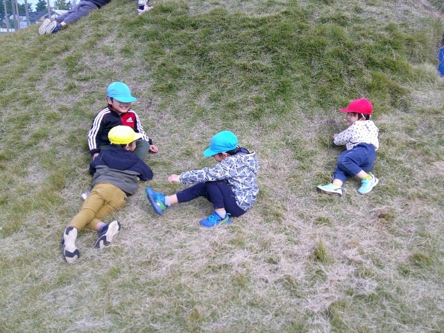 おいしいお弁当の後、芝生の山へ駆け出すと、友達と一緒に何度も登っては転がり、笑い声があふれていました。