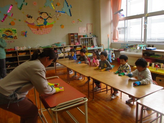 実は幼稚園には秘密の手袋があり、机で音を鳴らしてみると、とっても素敵な音になりました。