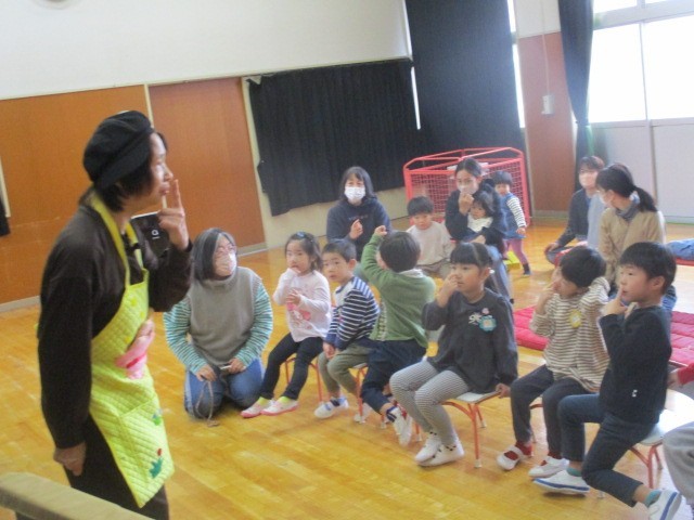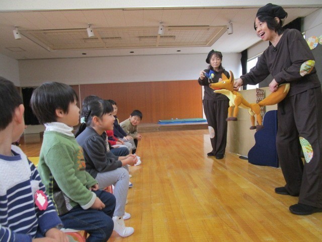 劇団ショコラの人形劇を親子サークルのお友達と一緒に観劇しました。オニが出てくる場面では、ドキドキした表情を見せる子もいましたが、お話の内容が進むにつれ笑ったり友達と顔を見合わせたり・・・お話の世界に浸っていました。