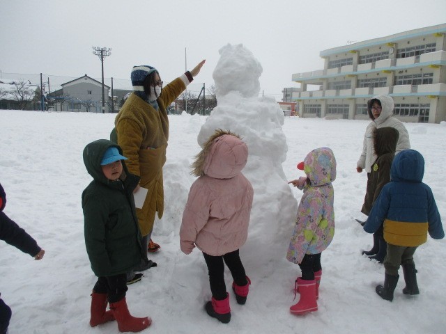 帰りは小学校の校庭に寄り道させてもらいました。小学生が作った雪だるまがとても大きく見えて、近くに寄ってみると・・・。なんと、みんなよりも先生よりも背が高いことが分かってびっくり!「どうやって作ったんだろうね。」「小学生ってなんでも作れるんだね。」と見上げていました。