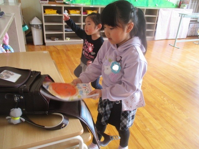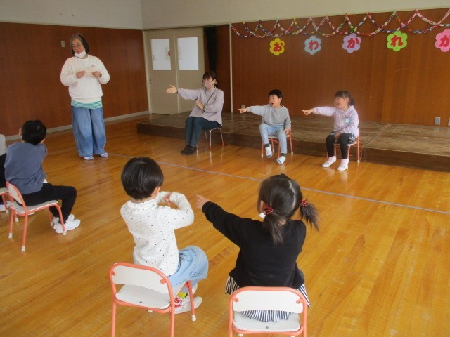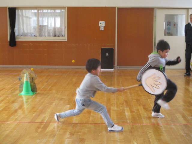 幼稚園のお友達当てクイズからスタート!先生の言うヒントをよく聞いて「自分かな・・・?」とソワソワしていたら、なんとお友達や先生でした・・・。ということだらけ。みんなで大笑いしたクイズでした。続いて年中、年少さんからの踊りのプレゼント。年長さんに「上手だね。」と褒めてもらって嬉しそうな年中年少さんでした。そして年長さんが考えた「ドキドキボールゲーム」では、スタートからゴールまで、ボールに当たらないように&通せんぼをしてくる年長さんにタッチされないように・・・という難しいルールにドキドキしながら、チャレンジしました。またみんなの大好きな宝さがしもお別れ会バージョン。年長さんはふでばこや教科書をランドセルに。年中、年少さんは自分のコップを通園カバンに。お互いに隠したり、探したりして楽しみました。一足先に1年生気分を味わっていた年長さんです。