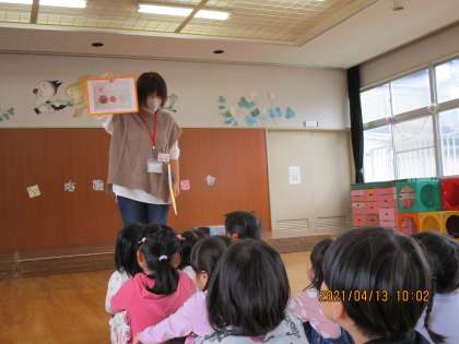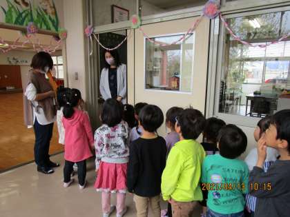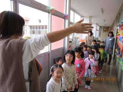 交通安全指導をしました 公開日 2021/04/13 更新日 2021/04/13 楽しい水橋幼稚園ニュース 4月13日(火) 今月の交通安全指導では、なかよしペアで手をつなぎ幼稚園内の散歩をしました。もも組にとっては初めての幼稚園探検。お兄さんお姉さんにリードされ、右側を歩きながらいろんな部屋を見て回りました。また、職員室に入るときは「お邪魔します」とあいさつをしてから入ることや、消火器やベルは触らないことなど、幼稚園の約束も確認しました。 安全に楽しく幼稚園生活を過ごそうね!