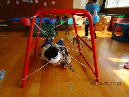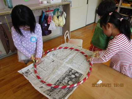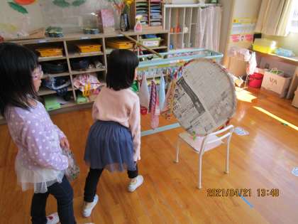 4月22日(木)忍者の絵本を見た年長児が、「忍者ごっこしたい」と言う話から、忍者遊びが始まりました。忍者の服作りや、クモの巣の間を通り抜ける遊び、手裏剣投げ等が日々、増えていっています。「手裏剣を持ちながらは遊べないから、服にポケットを付けてみたら」「クモの巣にクモを付けたい」「手裏剣当ての的は、新聞紙だと上手く刺さったよ」など、家庭でも遊んだ経験を基に、友達と相談しながらつくったり、遊んだりしている元気な子供たちです!
