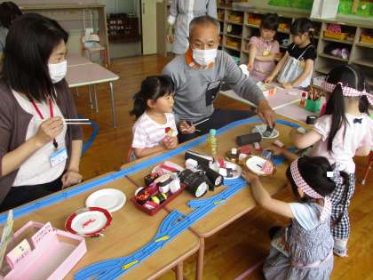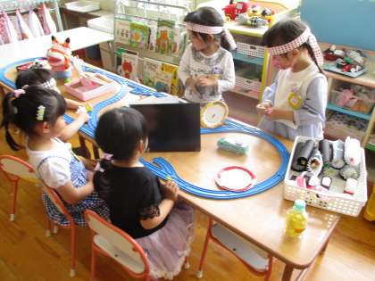 もも・さくら組では朝からお寿司屋さんの開店です!「へい、いらっしゃい!何にしますか?」「いくらください!」と元気な声が響いています。楽しい声を聞いて、たくさんのお客さんが食べに来てくれ、お店は大繁盛です。「メニューもあったらいい!」「タッチパネルも作ろう!」と、これまでの経験から遊びに必要なものを考え、自分たち遊びを進めていく楽しさを感じている子供たちです。