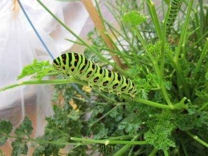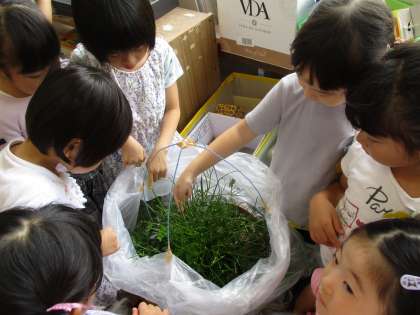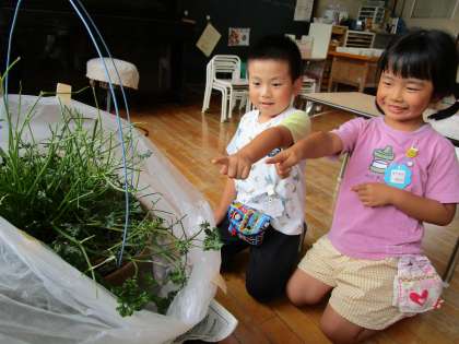 年長組に新しい友達が来たよ!? 公開日 2021/09/14 更新日 2021/09/14 楽しい水橋幼稚園ニュース 9月13日(月)虫が好きな年長組にパセリが好きな緑とオレンジ色の友達が来ました。春にいた青虫よりも大きく、色も違うので「これ何の幼虫?」と図鑑で調べると「キアゲハみたい」「黄色と黒のチョウになるんだね」「楽しみ」と興味津々。年中・年少児も「見せて」と幼虫に触れそうなくらいに指差しをしていますが、年長児は…。好きだけど触るのは…と控えめに指差していました。