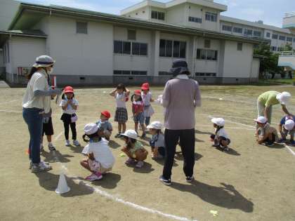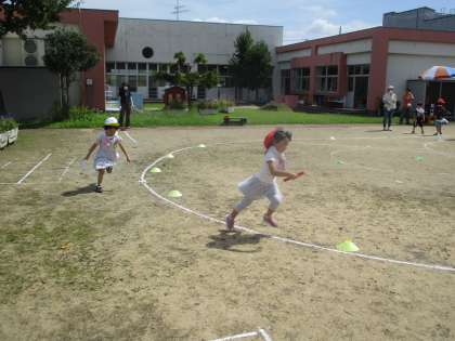 9月13日(月)年長児が毎日、トラックでリレーをしているのを見て、走ってみたくなった年中児。「まぜて」と言うと「いいよ」と年長児。年長・年中の混合チームになりました。同じ帽子の友達にバトンを渡し、勢いよく走り出す年中児。年長児もいつもより元気いっぱいな走りをしていました。赤・白チームが抜きつ抜かれつ、楽しいリレーでした。また一緒に走ろうね!