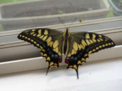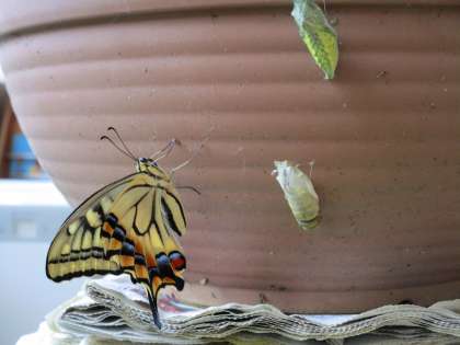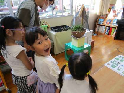 すごい!チョウになってる!PART1 公開日 2021/09/24 更新日 2021/09/24 楽しい水橋幼稚園ニュース 9月24日(金)水曜日にキアゲハの幼虫が8つもサナギなっていて「いつキアゲハになるのかな」と楽しみにしていた子供たち。今朝、「おはようございます」と部屋に入って来て、目に入ったキアゲハの成虫が3羽。「すごい!チョウになっている!」とビックリした子供たちは早速、年中・年少さんも呼んできてサナギの袋の穴をを見て「ここから出たのかな」と一緒に眺めていました。すると…