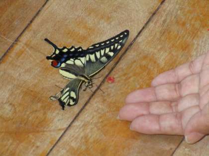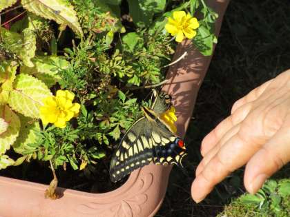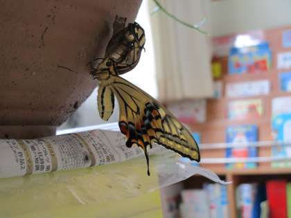 すると、一羽のチョウの羽が一枚うまく開けておらず、飛ぼうとしても落ちてしまう様子を見た子供たちは「頑張って!」と応援していました。なかなか飛べないチョウがかわいそうになり、教師が「お花のところに逃がしてあげよう」とそっと手を出すとチョウが乗りました。花壇の花にキアゲハを乗せると「元気でね」と優しく声をかける子供たち。運動会の練習前や園庭で遊ぶ時に「チョウ大丈夫かな」と何度も見に行き「蜜を吸っているのかな」と気にしながら見守っていました。また嬉しい報告ができるといいなと思います。