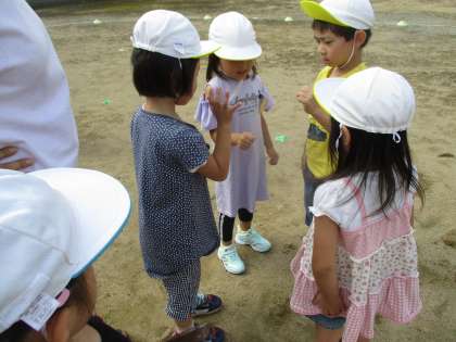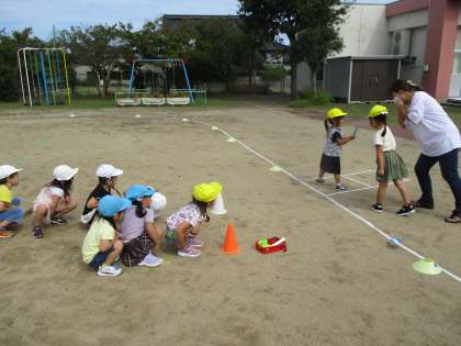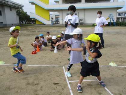 運動会後も体を使った遊びを楽しみたいと思い、今日はさくら・もも組でリレーをしました。いつもテントで応援していたもも組にとっては初めての経験でしたが、練習でさくら組やひまわり組をよく見ていただけあります。バトンをもらうと前を向いて力いっぱい走り、次の友達にバトンをつなぐことができました。今度は「ひまわり組も入れてみんなでリレーをしたいね」と話をしています。