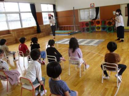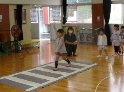 交通安全教室 公開日 2021/10/13 更新日 2021/10/13 楽しい水橋幼稚園ニュース 10月13日(水) 交通安全教室がありました。道路の安全な渡り方、飛び出しの危険、安全な遊び場、乗車時のシートベルトの着用など、大切なことをたくさん教えていただきました。模擬道路で一人ずつ横断歩行練習もしました。止まる、見る、聞く、手をあげて渡るという約束を思い出しながら、普段の生活でも実践していきたいですね。