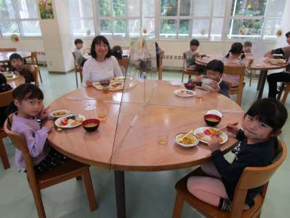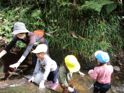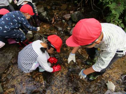 沢歩きでは、浅い川の流れの中を歩きました。沢までの道を降りていくと「なんか涼しくなってきた」「土のにおいがするよ」と、五感で自然を感じる姿が見られました。沢では石の上から流れている水に触れ「気持ちいい」「冷たい」と言ったり、少し深くなっている所も平気で入ったりしました。たくさん活動した後は昼食タイム。おいしいご飯をモリモリ食べて、にこにこの子供たちでした。お天気にも恵まれ、立山の自然にたくさん触れることができ、とても充実した一日になりました。