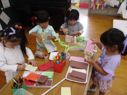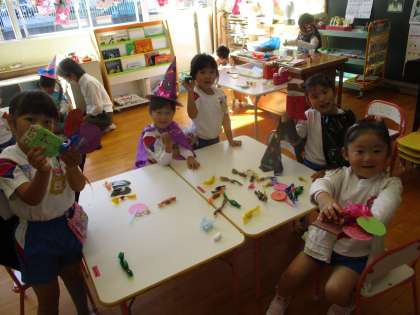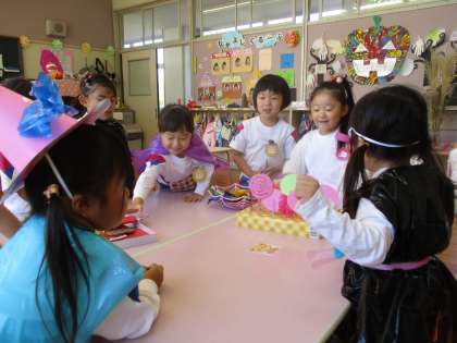 ハロウィンのお話の絵本を読み聞かせると「私もおばけになりたい」「おやつパーティがしたい」「おばけになって踊りたい」と楽しいアイディアが出てきました。仮装をするための洋服やお面、パーティに必要なおやつを作り「トリック・オア・トリート!」「お菓子くれなきゃいたずらするぞ」と友達とのやりとりを楽しんでいる子供たちです。