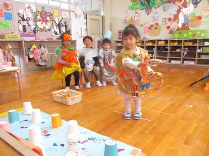 自分で作った衣装やお面を身に着けてお化けや魔女に仮装し、各部屋で楽しんでいるハロウィンのゲームコーナーを回って遊びました。さくら・もも組の部屋では、「あみだくじでチョコレートが当たった!」と嬉しそうな姿や「ドーナツ輪投げ、入らなかった悔しい…」という姿が見られました。ひまわり組の部屋ではよーく狙ってお化けの的当てに挑戦したり、友達と協力して隠されたカボチャを見つけたりしました。