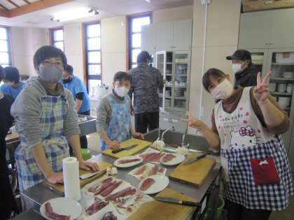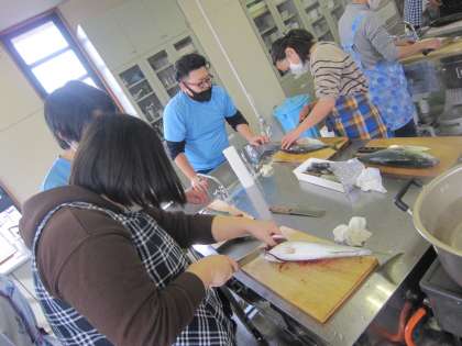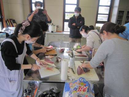 水橋漁民合同組合の漁師さんたちに、新鮮なふくらぎを準備していただき、さばき方を教えてもらいました。3枚におろした後、刺身にしました。骨の周りや頭は味噌汁のおいしい出汁が出そうです。「家でも、お魚を買ってさばけそう!」「今晩、みんなで食べるのが、楽しみ!」と参加されたママさんたちは、とっても満足そうでした。子供たちは、イカやシマダイが泳ぐ様子に興味深々。水橋漁民合同組合のみなさんには、たくさんのお魚を持ってきていただきありがとうございました。