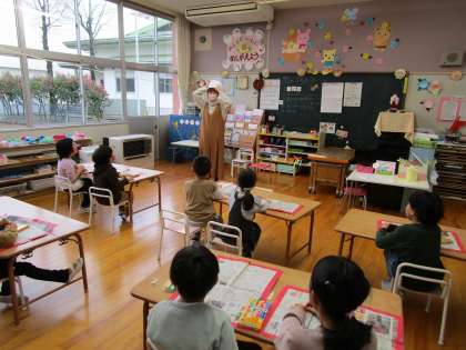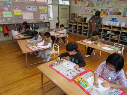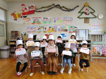 12月15日(水)保育参加があり、年長組に来られたお母さんが先生になって楽しい活動をしました。「みんなでパティシエになって、食べたいクリスマスケーキを描こう!」と白いケーキの土台に、クレヨンで好きな絵を描きました。イチゴやパイナップル等の果物、チョコレートやグミ、口の中ではじけるキャンディを描いたり、宇宙や恐竜をイメージして描いたりして、どれも素敵なクリスマスケーキに出来上がりました。グループごとに発表し「すごい!」「おいしそう!」と友達のケーキに興味津々の子供たち。最後にパティシエの帽子をかぶって記念撮影もしました。とても楽しい活動で子供たちは終始、笑顔でした。