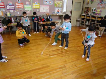 紐を巻くときは「…」無言で、回すときには「コマの持ち方はこうだっけ?」「投げる方向はどっちだっけ?」と確認しながら膝を曲げて、ポーズをとって「えい!」日に日に回せる友達が増えてきました。毎日続けることでコツを掴んで「回せた!」「すごい!」「よかったね!」と、みんなで頑張り中です!