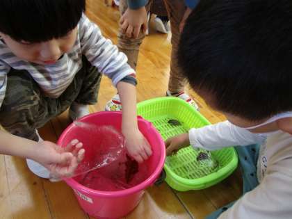 先週は日向と日陰ではどっちが早く氷が融けるか観察しました。今度は「日陰の棚よりももっと氷が融けない場所に置いてみよう!」と廊下に置いてみました。お茶教室や給食後、午後の大掃除の後に何度も見に行き「まだ、どっちも氷が残っている」と確かめていました。今日は日陰の棚のほうが融けていましたが、どちらの氷も残っていたので「このまま残してみよう。明日の朝まであるといいな」と元の場所に戻して、楽しみに帰って行った子供たち。明日の朝、どうなっているかな…