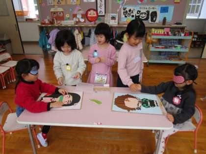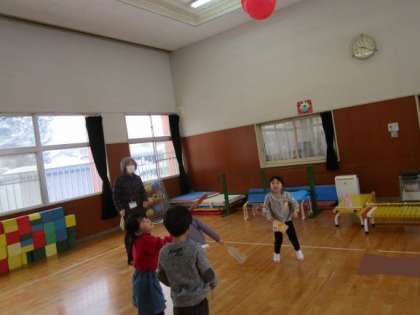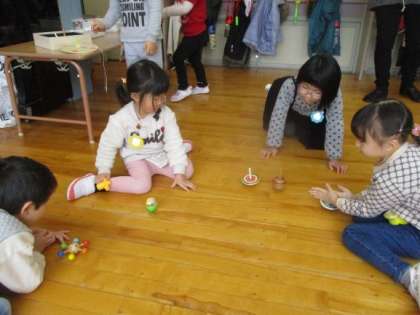 いろいろなお正月遊びのコーナーで遊びました。3・4・5歳児みんなで交流し、福笑いやこま、羽根つき、けん玉、お手玉など、やりたい遊びを誘い合って遊んでいました。1月中は、引き続きお正月遊びを楽しめるようにしたいと思います。