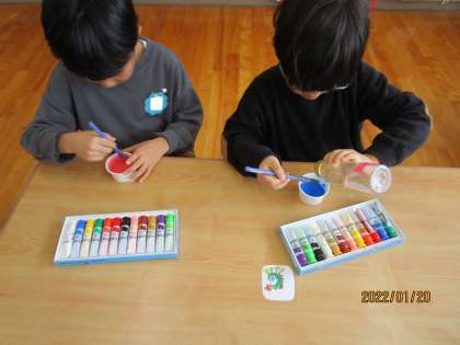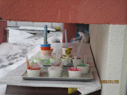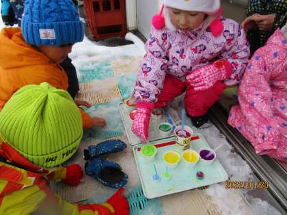 1月20日(木)毎日、雪遊びを楽しんでいる子供たち。雪でごちそうを作っていた子が「雪ってガリガリくんみたいだね」「本当だ。作ってみたい!」ということで、みんなでガリガリくん(氷)を作ることにしました。「僕はソーダー味!」「コーラーって何色だっけ?」と自分の絵の具から思い思いの味の色を空き容器に作りました。「雪も入れたら早く氷になるかもしれない」との提案に「そうだね」と雪を少し入れました。「明日の朝、どうなっているかな」「楽しみだね」と明日の朝が楽しみな子供たちです。降園後、早速様子を見に行っている子供もいましたよ。