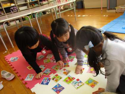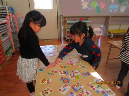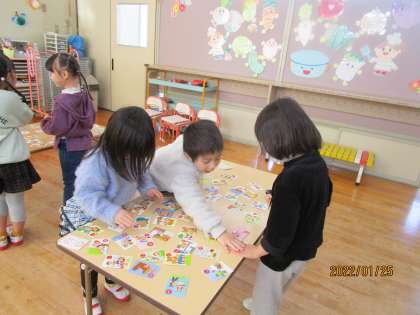 かるた取り会をしたよ!(もも・さくら組) 公開日 2022/01/25 更新日 2022/01/25 楽しい水橋幼稚園ニュース 1月25日(火) いろいろなお正月遊びに親しんできた子供たち。今日はみんなでかるた取り会をしました。札を並べて、やる気満々な子供たち。何度も遊ぶうちに絵柄や文字を覚えたり、自分の名前は取るぞと狙いを定めたりするようになり、前回よりもたくさん取ろうと真剣な顔が見られました。最後に頑張り賞として賞状をもらい嬉しそうな子供たちでした。