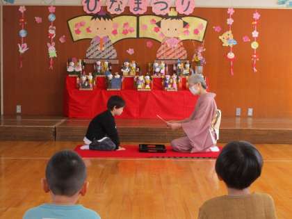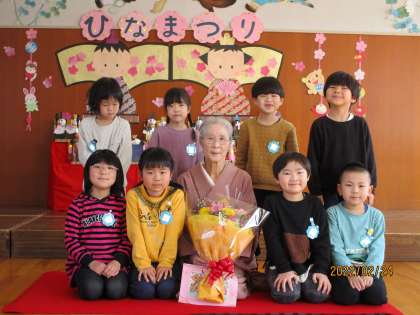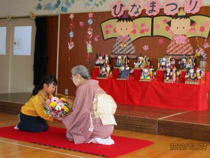 お茶教室の先生から『おしるし』をいただきました 公開日 2022/02/25 更新日 2022/02/25 楽しい水橋幼稚園ニュース 2月24日(木)お茶教室の先生から「2年間お茶のお稽古をして、おいしいお茶を点てられるようになりましたね」と『おしるし』をいただきました。静かに過ごすお茶教室の時間は子供たちにとってよい経験になったと思います。子供たちからは、お茶の先生にお礼の花束や手紙を渡しました。最後に記念撮影もしました。みんな背筋が伸びてすてきな年長さんです。
