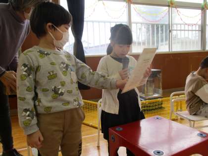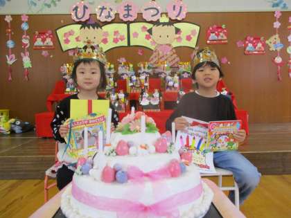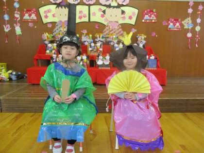 今日はひな祭り。子供たちが作ったひな人形をステージに飾り、3月の誕生児とひな祭りをみんなでお祝いしました。お楽しみコーナーでは、ひな祭りにちなんで、すまし顔で写真を撮ったり集まりっこの遊びをしたりしました。くじ引きを引いて友達とペアになり、お雛様とお内裏様に変身しました。色々なすまし顔が見られましたよ。最後には「うれしいひな祭り」の歌を歌い、笑顔があふれる楽しい誕生会になりました。