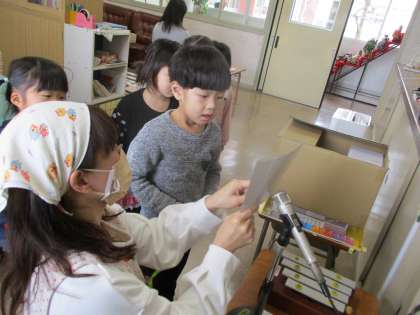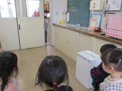 3月に入り、もうすぐで年中・年長児になることを自覚してきたもも・さくら組の子供たち。もも組は朝の会や帰りの会を進める当番を、さくら組はひまわり組がやってきた給食の放送当番を引継ぎしています。放送当番の様子を見た子供たちは「鉄琴を鳴らしていたよ」「ボタンをポチってして話をするんだね」と色々な気付きがあったようです。人の前に立つことや、人の役に立つことがうれしい様子の子供たち。頑張っている姿や、意欲を認めながら進級への期待につなげていきたいと思います。