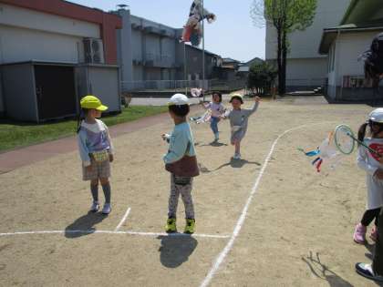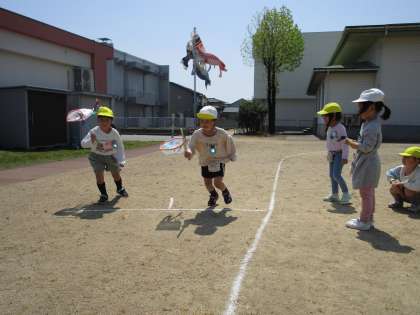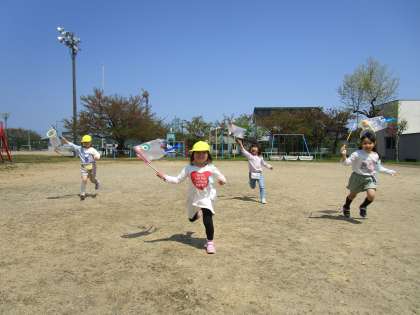 ひまわり組ではクラスのみんなで作る大きなこいのぼりと、自分だけのこいのぼりが欲しいという言葉から2匹のこいのぼりを製作しました。今日は自分のこいのぼりが完成し、外に出て泳がせることに。こいのぼりを持ってかけっこすると、「風を食べてるよ」「膨らんだ!」と子供たち。園庭を走り回り、元気いっぱいの子供たちでした。最後は、こいのぼりをバトンにして、リレーをしました。今日は一勝ずつの引き分け。次はどんな勝負になるかな?