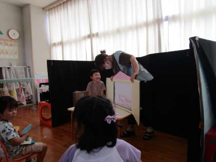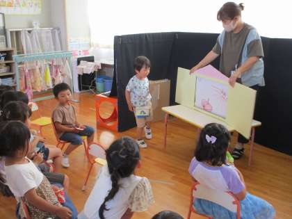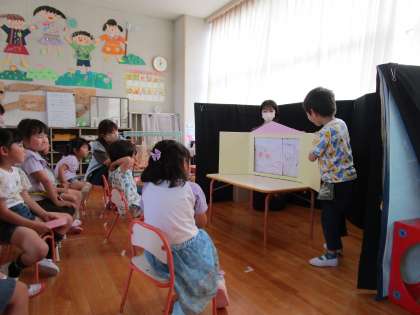 映画館ごっこでは、ひまわり組の友達から「もも組、さくら組も映画をつくったらいいんじゃない?」と提案があり「やりたい!」「私もつくる!」と映画を作りはじめたもも・さくら組さん。ひまわり組も「2つ目の映画をつくる!」と意欲的です。それぞれ描きたい話が決まっていて、絵本に沿った話や自分で考えた話を絵にかいて表現しました。今日は出来上がった映画をみんなの前で上映し、話したり見たりすることを楽しみました!
