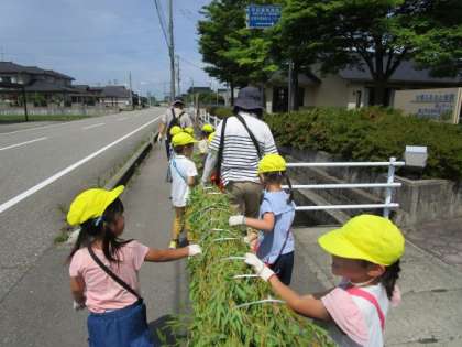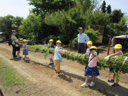 七夕に向けて、いろいろな笹飾りをつくり始めています。今日は、年長児が幼稚園の近くのお宅まで笹竹をもらいに出かけました。そびえ立つ立派な竹に「おっきいね」「もてるかな」と子供たち。みんなで力を合わせ「ワッショイ、ワッショイ」と気合を入れて運びました。道中、ご近所の方に「あらー、大変だね。頑張って」と声をかけてもらったり、交番のお巡りさんに「みんな力持ちだね。車に気を付けてね」と見守ってもらったりして、無事、到着。地域の方の優しさに触れ、自分たちの足で笹竹を運ぶ体験ができ、達成感でいっぱいの子供たちでした。素敵な飾りや願い事を飾るのが楽しみです。