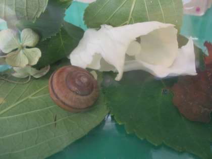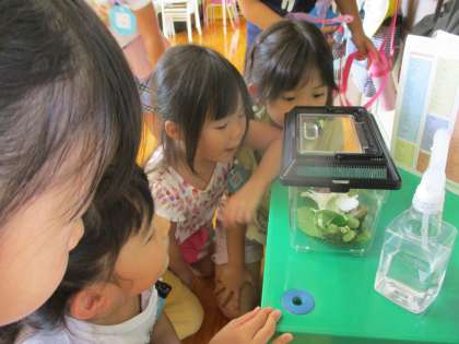 園庭でかたつむりを見つけ「お部屋で育てたい!」と子供たち。「誰がお世話をするの?」と教師が尋ねると「その日の当番の人がやるのはどう?」「掃除タイムの時にみんなでするのは?」と、いろいろな考えが出てきました。そのどれもが、自分たちで世話をしていこうという気持ちが感じられるものでした。5、6月に様々な生き物を飼育し、命の大切さに気付いたり、生き物を育てることへの責任感を感じたりしてきたことが、今の子供たちの言葉や思いに繋がっているのかもしれませんね。