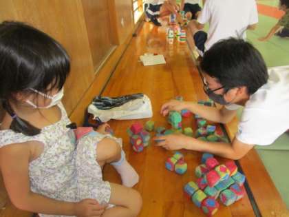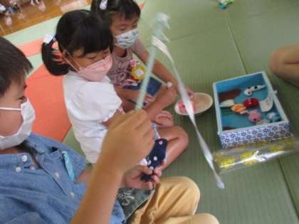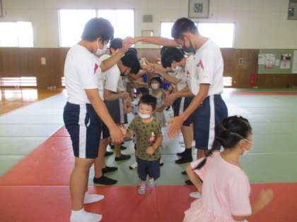 中学生さんとの交流1 公開日 2022/10/04 更新日 2022/10/04 楽しい水橋幼稚園ニュース 10月4日(火) 水橋中学校3年生との交流会がありました。初めて中学校の道場に入らせていただき「どんなことをするのかな」「楽しみだね」と期待が膨らみます。中学生のお兄さんお姉さんが優しく迎え入れてくださり、たくさんの手作りおもちゃに触れた子どもたち。魚釣りや輪投げ、ボーリング、的あて等、どれで遊ぼうか迷う程でした。一つ一つ遊び方を教えてもらいながら30分程じっくりと遊びました。